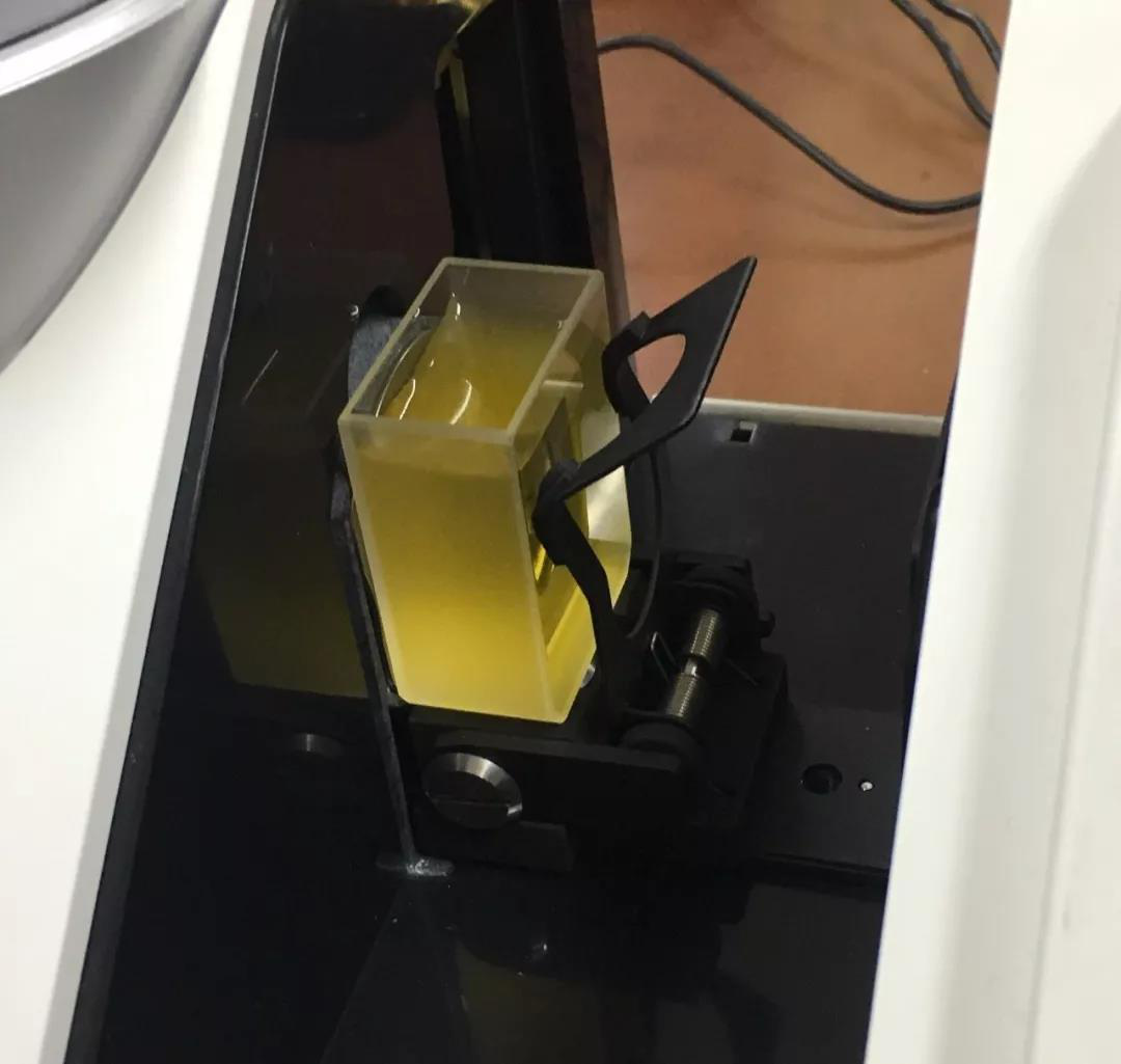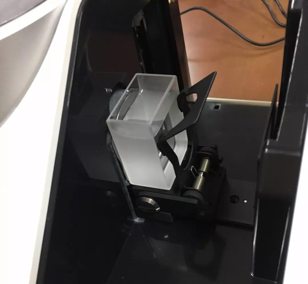 (注意:在拿取比色皿时,捏住两侧磨砂玻璃面即可,避免触摸光滑的两面影响透射测量效果。)